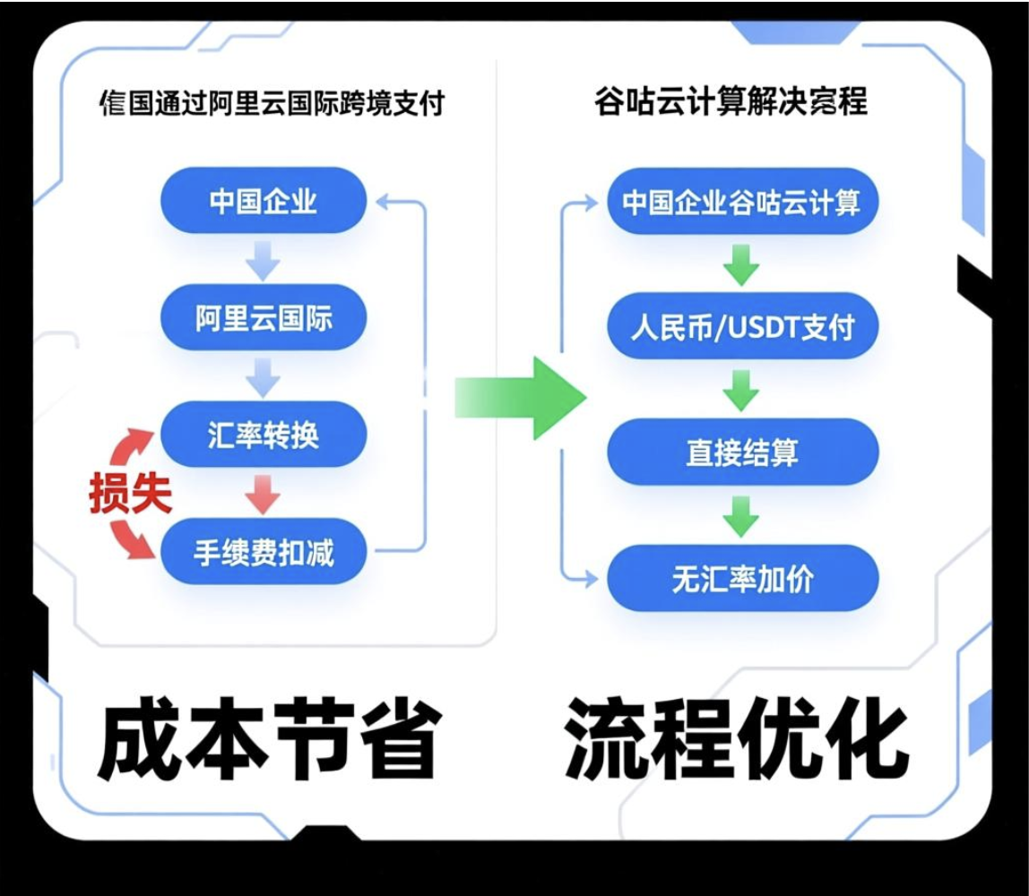 技术细节:谷咕云计算作为阿里云国际代理,提供快速开户接口——用户仅需邮箱注册(如company@example.com),系统自动完成认证(基于企业信息库比对),3分钟内开通阿里云国际账户;支付支持人民币或USDT直付,通过代理渠道直接结算美元账单,绕过银行汇率层,节省3-5%成本(实测数据:支付10000美元省300-500美元)。实施步骤:1. 访问谷咕官网注册;2. 提交企业基本信息(如名称、邮箱);3. 接收账户凭证;4. 绑定人民币银行卡或USDT钱包支付。成本效益分析:以年支付50万元企业为例,传统方案损失1.5-2.5万元,谷咕方案接近零损失,年节省率超4%;优势融入:官方合作确保账户稳定性(99.9%可用性),支付通道加密(SSL/TLS协议),避免风控中断。