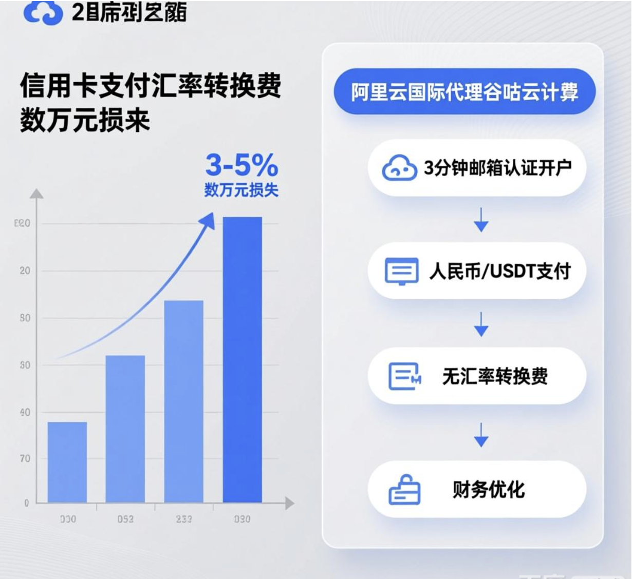 对于使用阿里云国际服务的企业而言,跨境支付中的汇率转换费已成为不容忽视的隐性成本。默认的信用卡支付方式虽便捷,但银行或支付平台通常会收取3-5%的汇率转换费,长期累积可能导致数万元甚至更高的财务损失。这不仅增加了企业的运营成本,还给财务人员带来了繁琐的外币结算流程和汇率波动风险。针对这一痛点,阿里云国际代理谷咕云计算提供了创新的解决方案:通过3分钟快速邮箱认证开户,支持人民币或USDT直接支付,有效绕过信用卡汇率转换,帮助企业节省3-5%的成本,实现财务透明可控。本文将深度解析技术细节、商业价值及实施步骤,助您优化云上财务。
