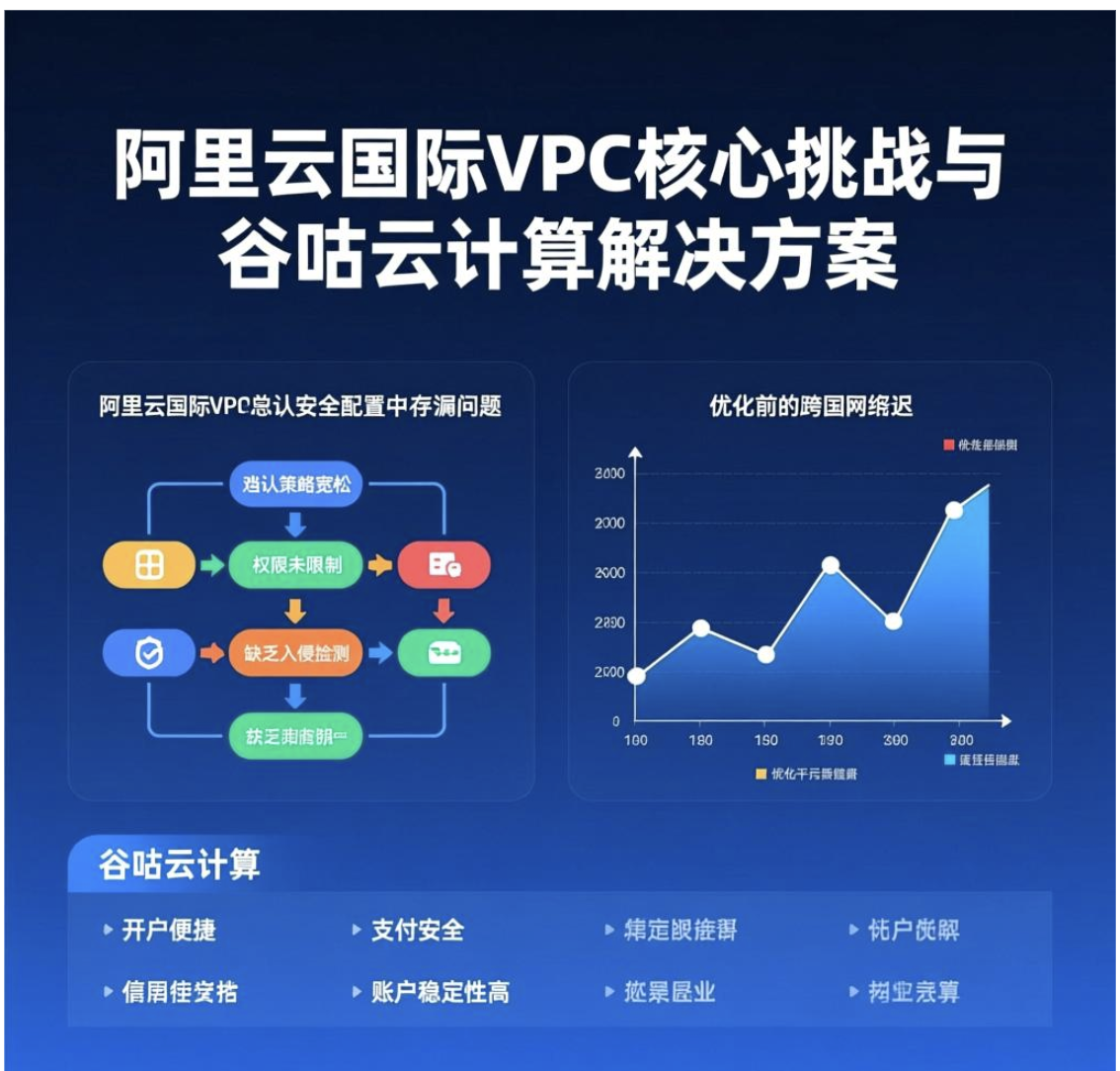 在全球化业务部署中,阿里云国际VPC的默认安全配置与跨国网络延迟问题,已成为企业面临的两大核心挑战。一方面,VPC默认开放端口过多,导致安全漏洞频发,攻击尝试日均可达数百次;另一方面,跨国路由选择不佳,延迟波动高达50ms以上,直接影响用户体验与业务连续性。传统解决方案往往顾此失彼,难以在安全与性能间取得平衡。谷咕云计算作为专业的阿里云国际代理,通过3分钟邮箱快速开户、人民币/USDT支付支持、官方合作保障账户稳定等优势,结合VPC安全组自动优化与全球加速节点部署,帮助企业将攻击尝试降低90%,延迟波动控制在10ms内,实现月均成本节省30%。本文将从技术、商业、行业及用户多维度深度解析,并提供实操步骤与最佳实践。