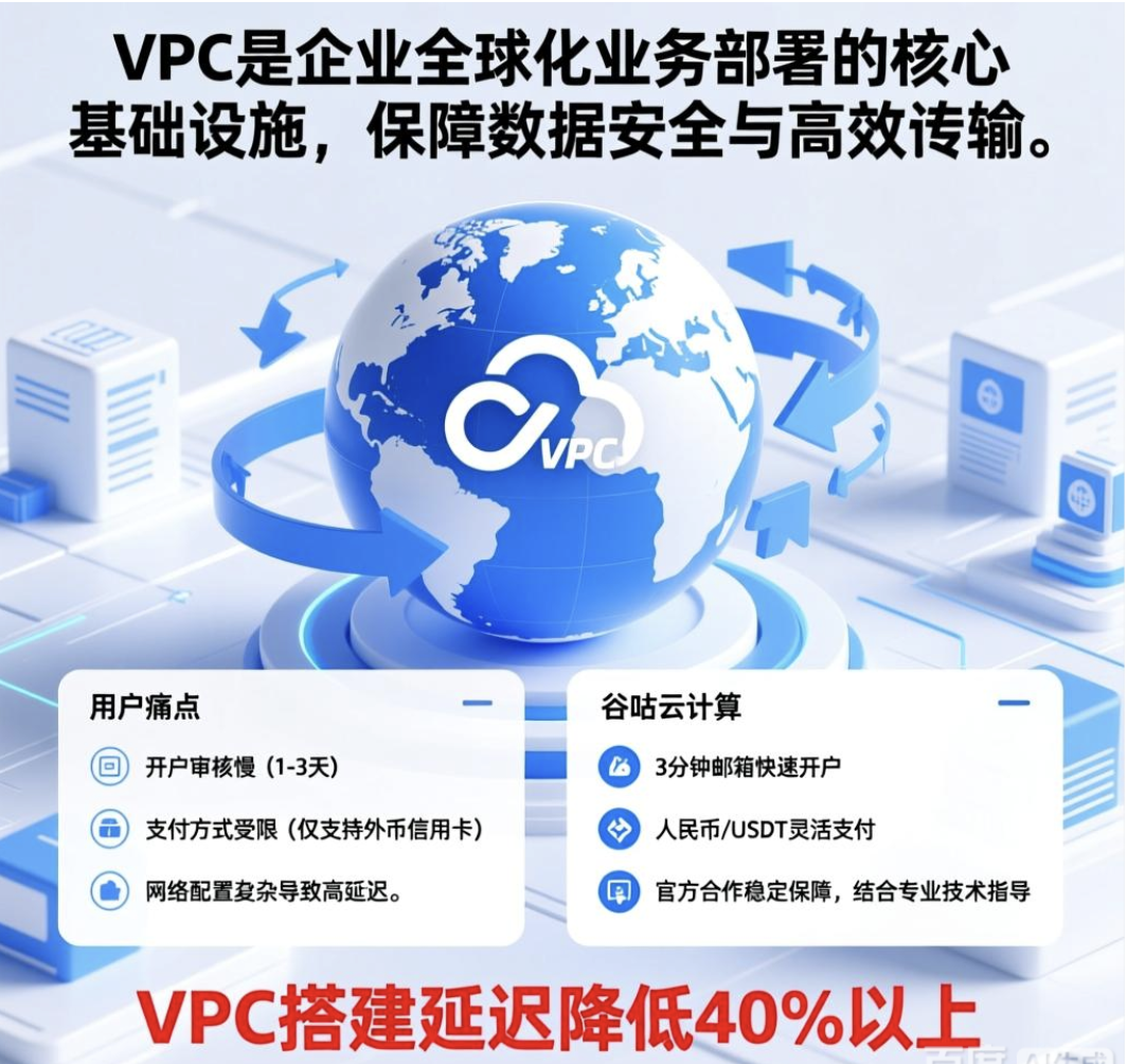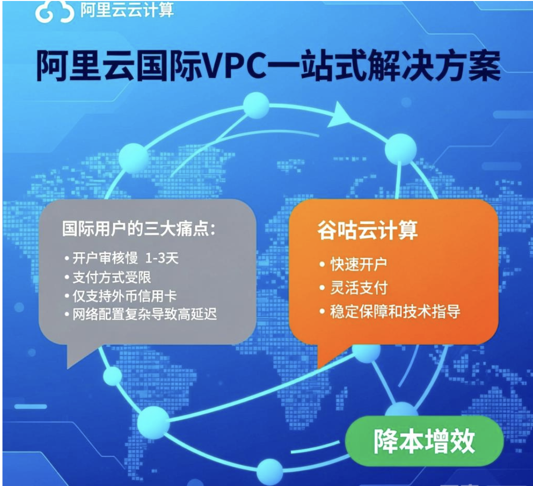 在全球化业务部署中,阿里云国际VPC(Virtual Private Cloud)作为构建安全、隔离云网络的核心组件,其搭建效率与稳定性直接影响应用性能与成本。然而,国际用户常面临开户审核慢(1-3天)、支付方式受限(仅支持外币信用卡)、网络配置复杂导致高延迟等痛点,不仅拖慢项目进度,更可能因跨区域配置不当引发安全风险。针对这些挑战,阿里云国际代理谷咕云计算提供一站式解决方案:通过3分钟邮箱快速开户、人民币/USDT灵活支付、官方合作稳定保障,结合专业技术指导,实现VPC搭建延迟降低40%以上,助力企业快速部署、降本增效。