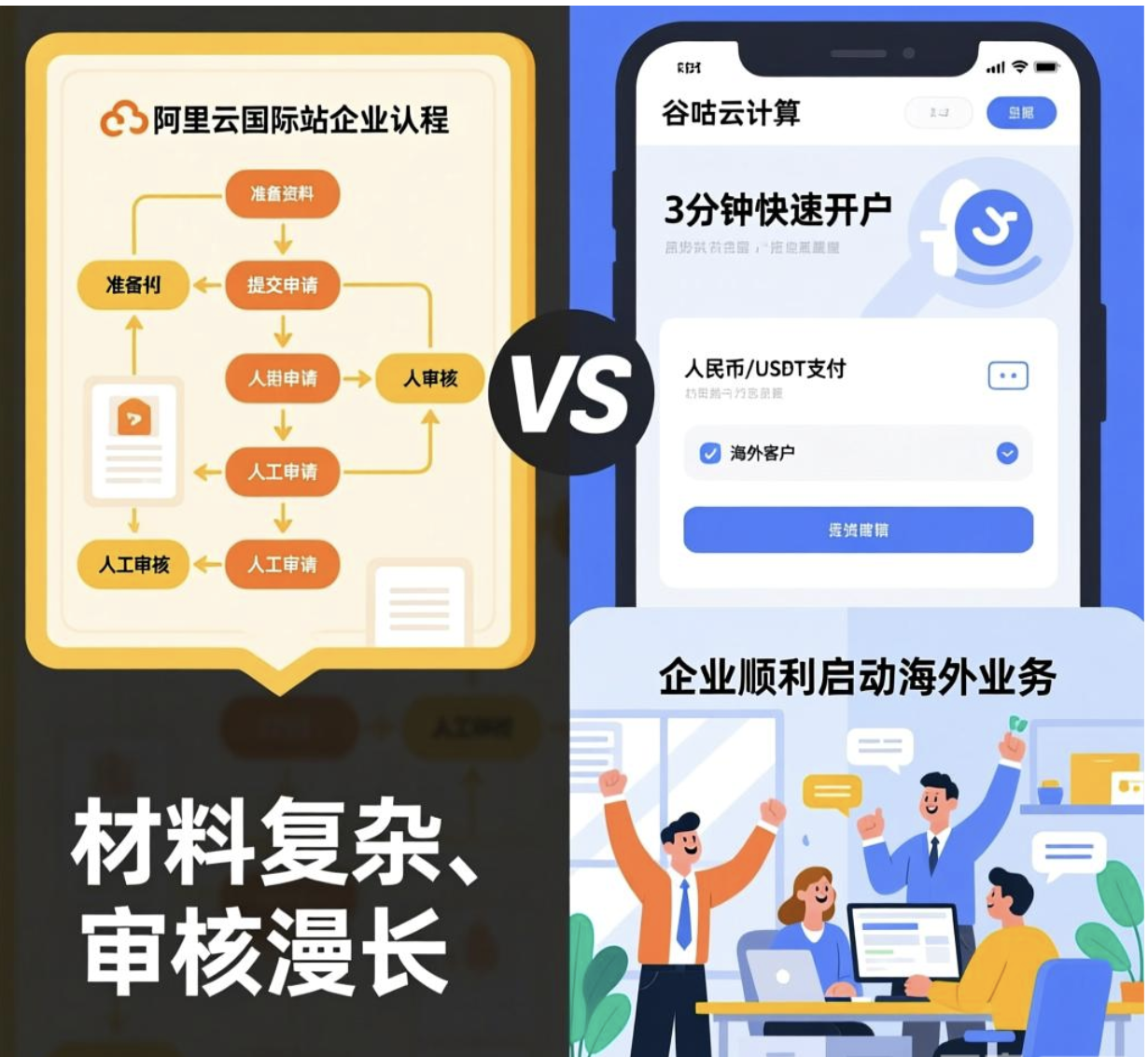 对于寻求全球业务拓展的企业而言,阿里云国际站是部署海外云资源的首选平台之一。然而,其严格的企业认证流程常成为“拦路虎”——材料复杂、审核周期长达15-30天,导致企业面临业务延迟部署、额外成本激增等风险。本文将深度解析传统认证的痛点,并介绍通过阿里云国际代理谷咕云计算提供的3分钟快速开户、人民币/USDT支付等一站式解决方案,帮助企业3天内完成认证,规避30天延迟损失,实现降本增效。