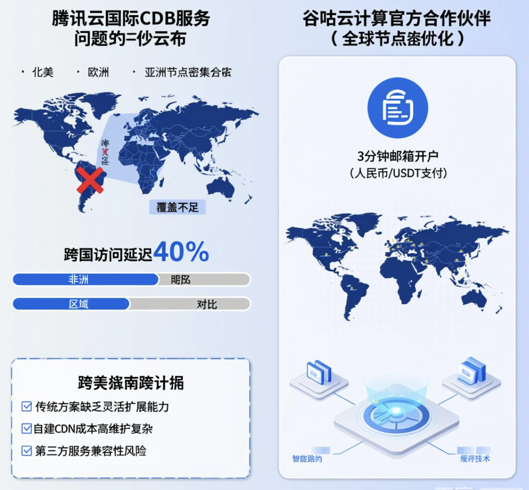 随着企业全球化业务扩张,腾讯云国际CDB(云数据库)的海外加速服务面临严峻挑战:节点覆盖集中在北美、欧洲和亚洲部分地区,非洲、南美等新兴市场覆盖不足,导致跨国访问时网络延迟和路由不稳定,性能下降高达40%,严重影响数据库响应时间和应用可用性。传统方案依赖单一云厂商,缺乏灵活的节点扩展和优化能力,而自建CDN或代理服务器成本高昂、维护复杂,第三方加速服务又存在兼容性和稳定性风险。针对这些痛点,谷咕云计算作为官方合作伙伴,提供一站式解决方案:通过3分钟快速邮箱开户和可认证开户简化注册流程,支持人民币和USDT支付降低跨境门槛,结合全球节点优化、智能路由和缓存技术,显著提升CDB跨国访问性能。立即通过腾讯云国际代理谷咕云计算,优化您的数据库性能,避免业务损失!