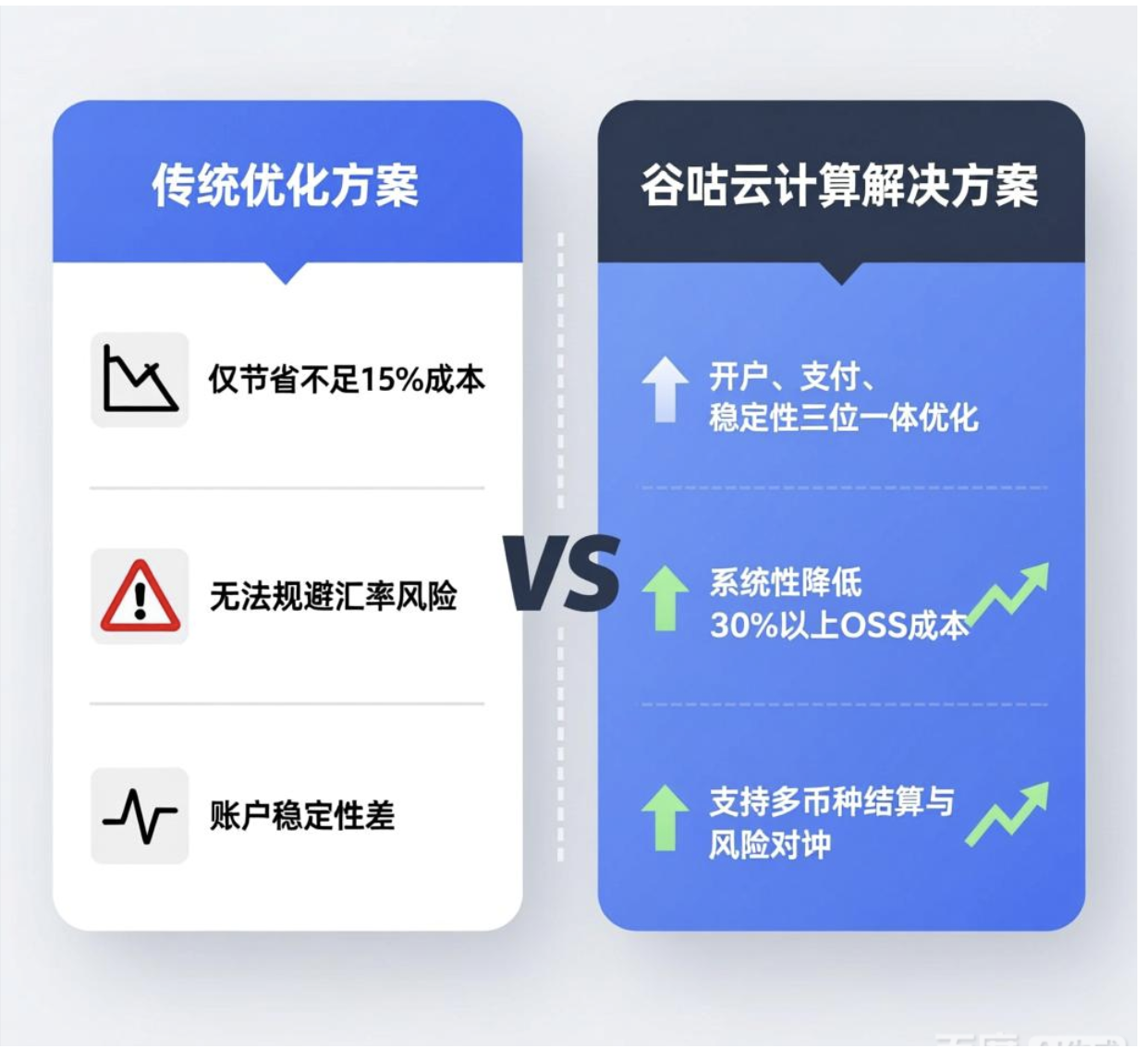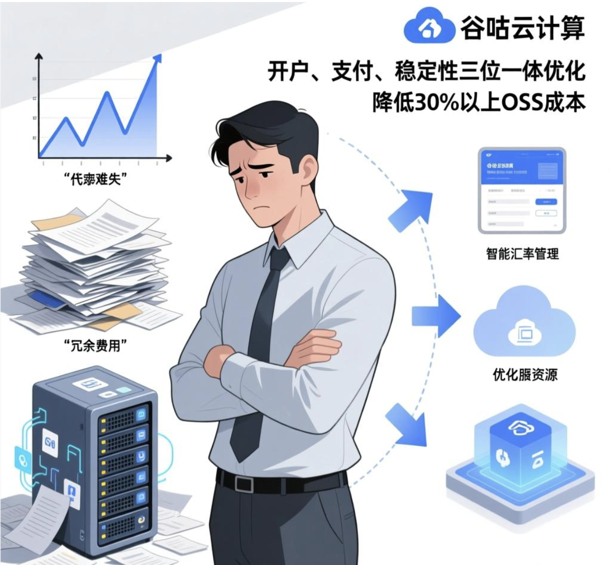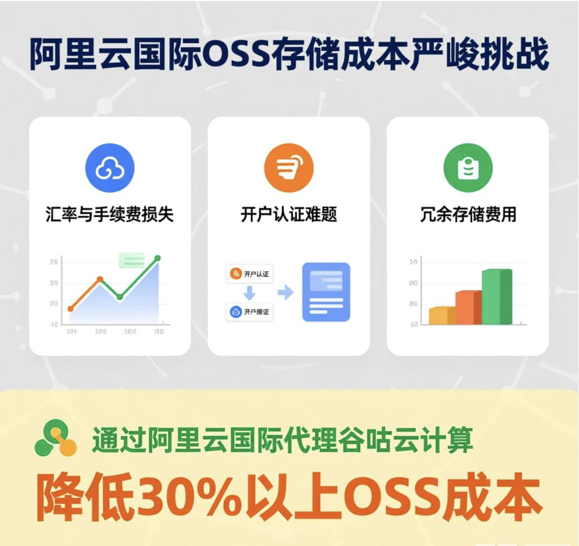 随着企业全球化业务扩张,阿里云国际OSS存储成本正成为技术负责人面临的严峻挑战。跨境支付带来的汇率损失叠加手续费、复杂的官方开户流程与漫长认证周期、以及存储生命周期管理不当导致的冗余费用,三大根源共同推高了企业云存储支出。传统优化方案往往收效甚微,仅靠调整存储类型节省不足15%,且无法规避汇率波动风险,账户稳定性问题更可能随时中断业务。本文将深度解析这些痛点,并提供一套经过验证的解决方案——通过阿里云国际代理谷咕云计算,实现开户、支付、稳定性三位一体的优化,帮助技术负责人系统性降低30%以上OSS成本。