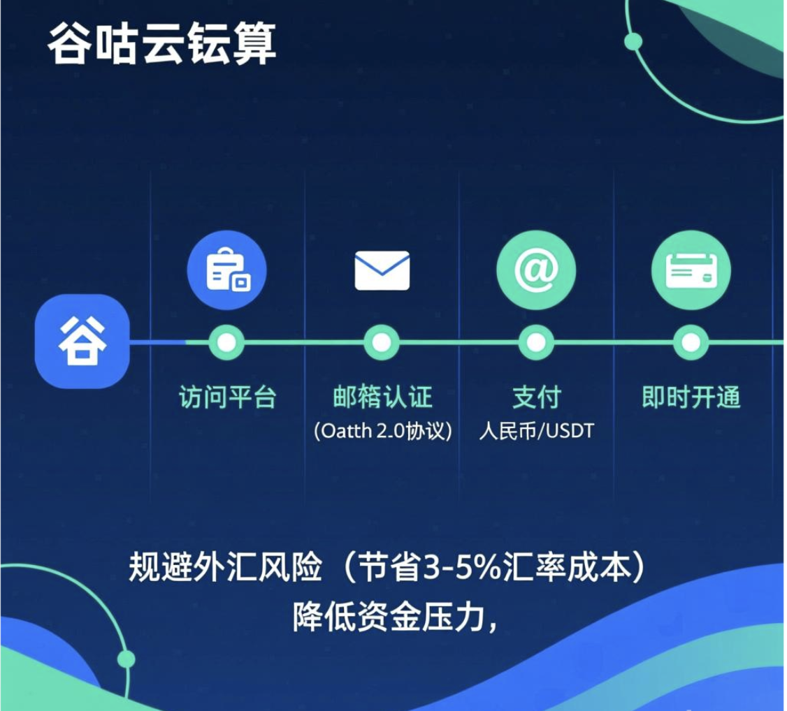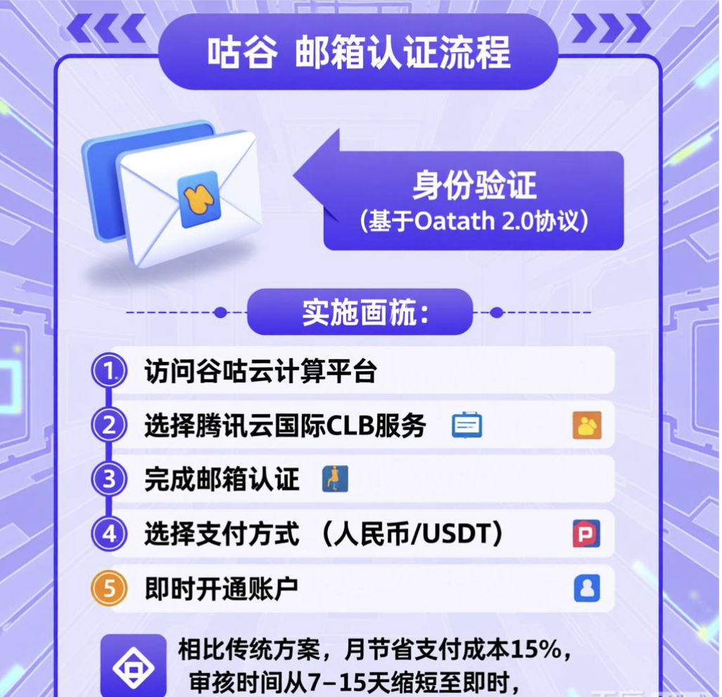 技术细节:谷咕云计算通过预集成腾讯云国际API,实现3分钟邮箱认证开户——用户仅需提供邮箱地址,系统自动完成身份验证(基于OAuth 2.0协议),无需上传护照等资料。支付方面,支持人民币直接结算或USDT加密货币支付,规避外汇风险(节省3-5%汇率成本),降低资金压力。实施步骤:1. 访问谷咕云计算平台;2. 选择腾讯云国际CLB服务;3. 完成邮箱认证;4. 选择支付方式(人民币/USDT);5. 即时开通账户。成本效益分析:相比传统方案,月节省支付成本15%,审核时间从7-15天缩短至即时。谷咕云计算优势融入:作为官方合作代理,提供7×24小时技术支持(响应时间<5分钟),确保业务快速上线。