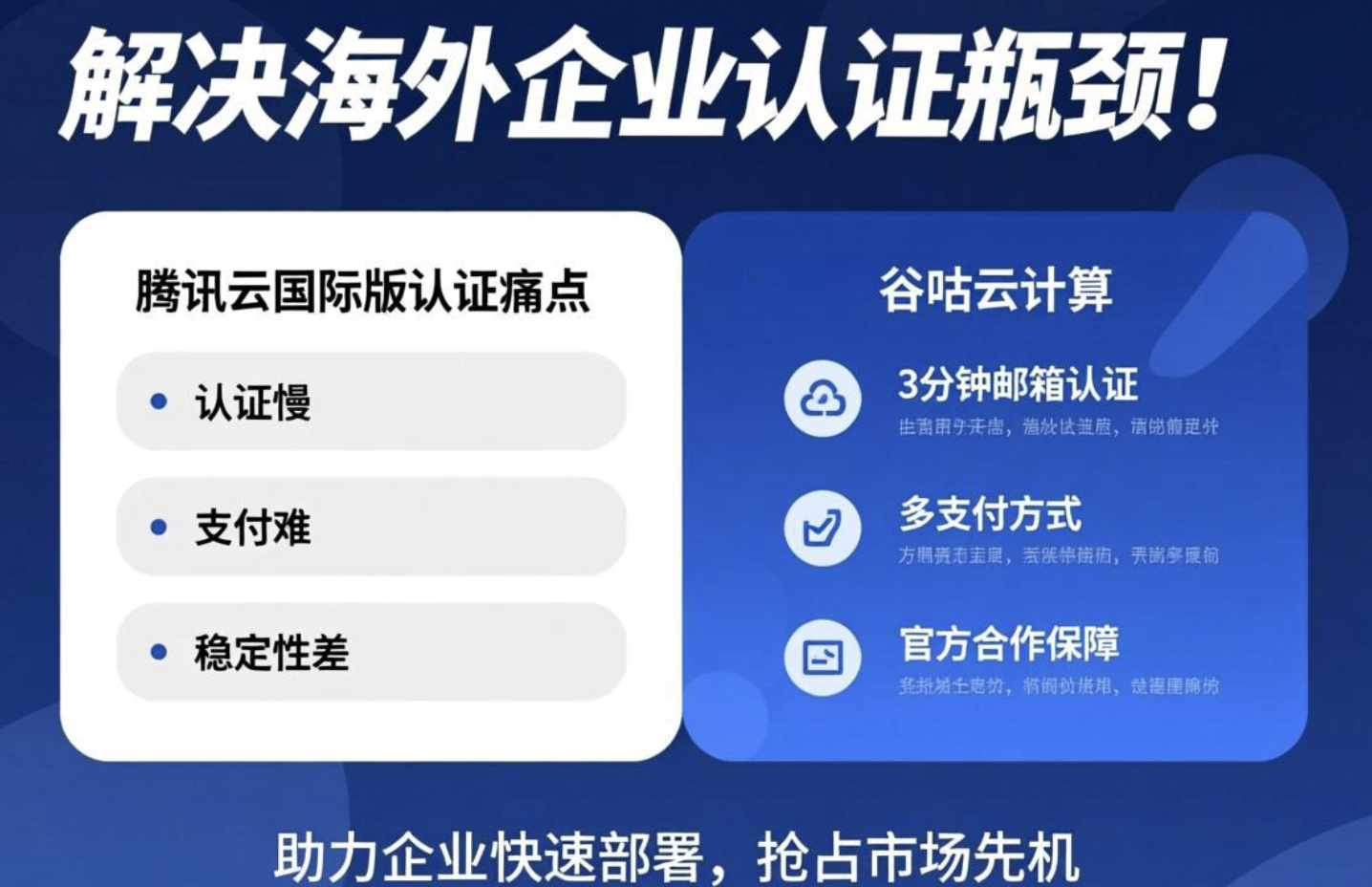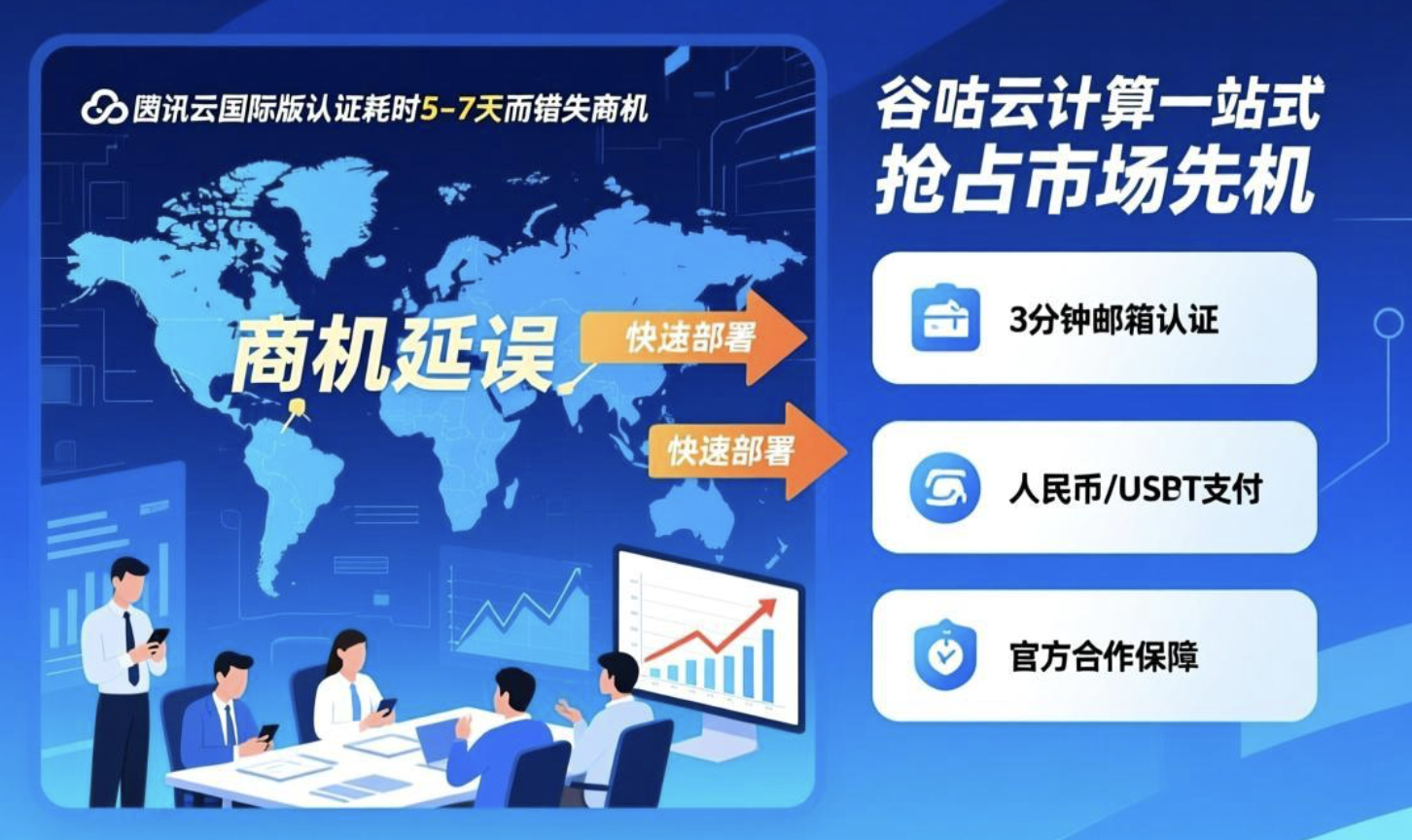 对于急于拓展海外市场的企业而言,腾讯云国际版的企业认证流程耗时5-7天,常成为业务上线的瓶颈。材料审核严格、支付流程复杂、时差沟通障碍,每一步都可能延误商机。谷咕云计算作为腾讯云国际代理,推出3分钟邮箱认证开户方案,结合人民币/USDT支付与官方合作保障,一站式解决认证慢、支付难、稳定性差三大痛点,助力企业快速部署,抢占市场先机。