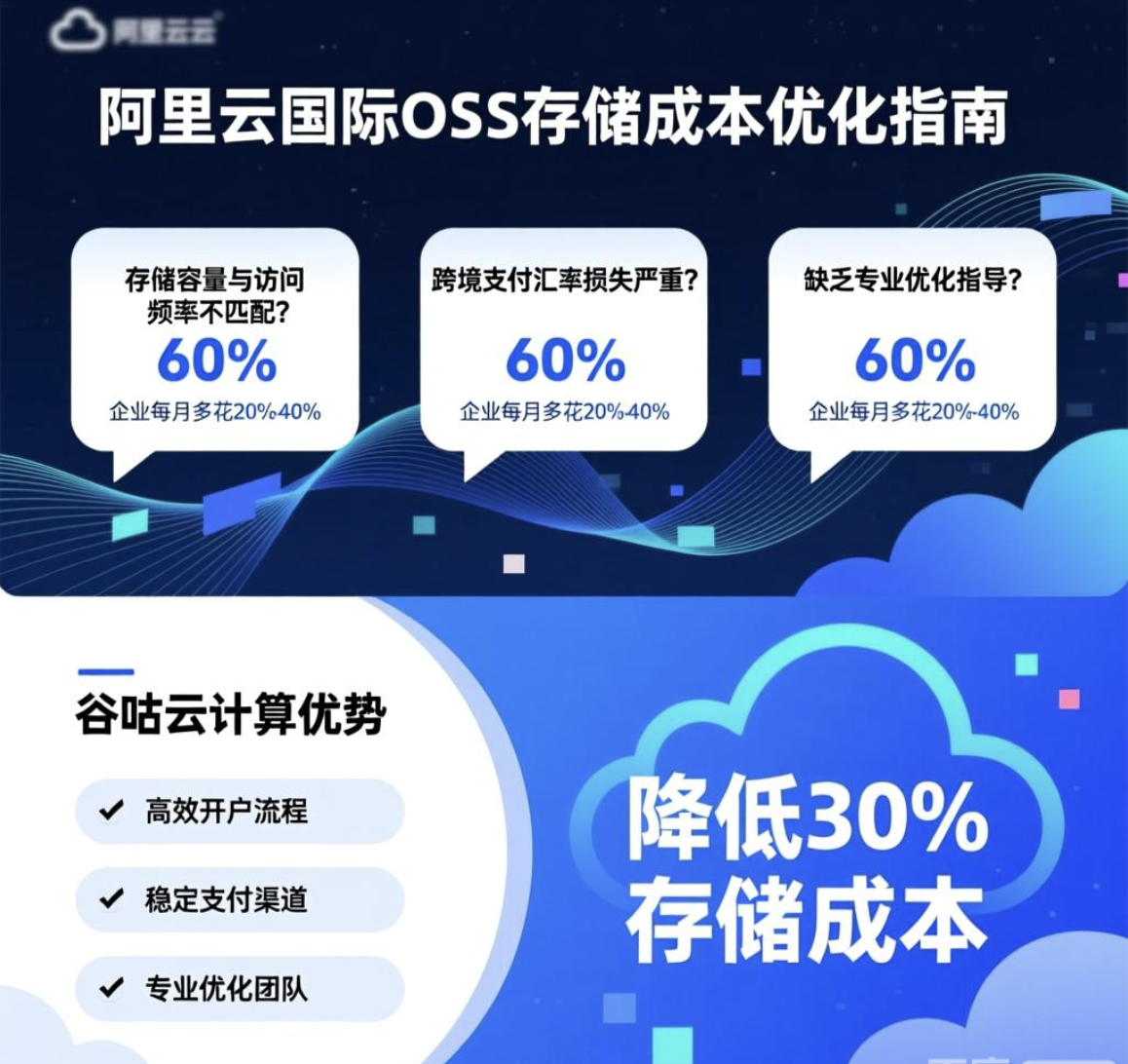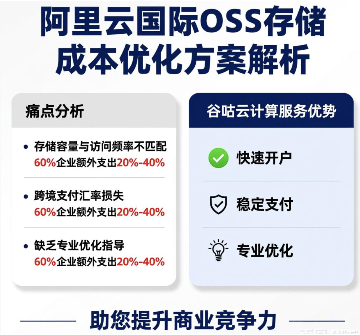 对于使用阿里云国际OSS(对象存储服务)的企业而言,高昂的存储成本往往是业务扩张中的一大痛点。据统计,超过60%的企业用户因存储容量与访问频率不匹配、跨境支付汇率损失以及缺乏专业优化指导,导致每月额外支出20%-40%的费用。本文将深度解析阿里云国际OSS成本高的三大根源,并提供一套经过验证的优化方案,结合阿里云国际代理谷咕云计算的开户、支付和稳定性优势,助您轻松降低30%存储成本,提升商业竞争力。