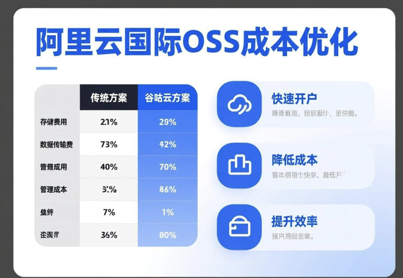 阿里云国际OSS作为全球领先的对象存储服务,其按存储容量、请求次数和流量计费的复杂模式,加上跨境支付带来的汇率损失和手续费,常使企业存储成本居高不下。传统优化方法如数据分层或压缩,虽能缓解部分压力,但实施复杂、风险高且效果有限。本文将深度解析成本根源,揭示传统方案的局限,并介绍通过阿里云国际代理谷咕云计算提供的3分钟快速开户、人民币/USDT支付等一站式解决方案,帮助企业轻松实现30%成本降低,提升运维效率与商业价值。
