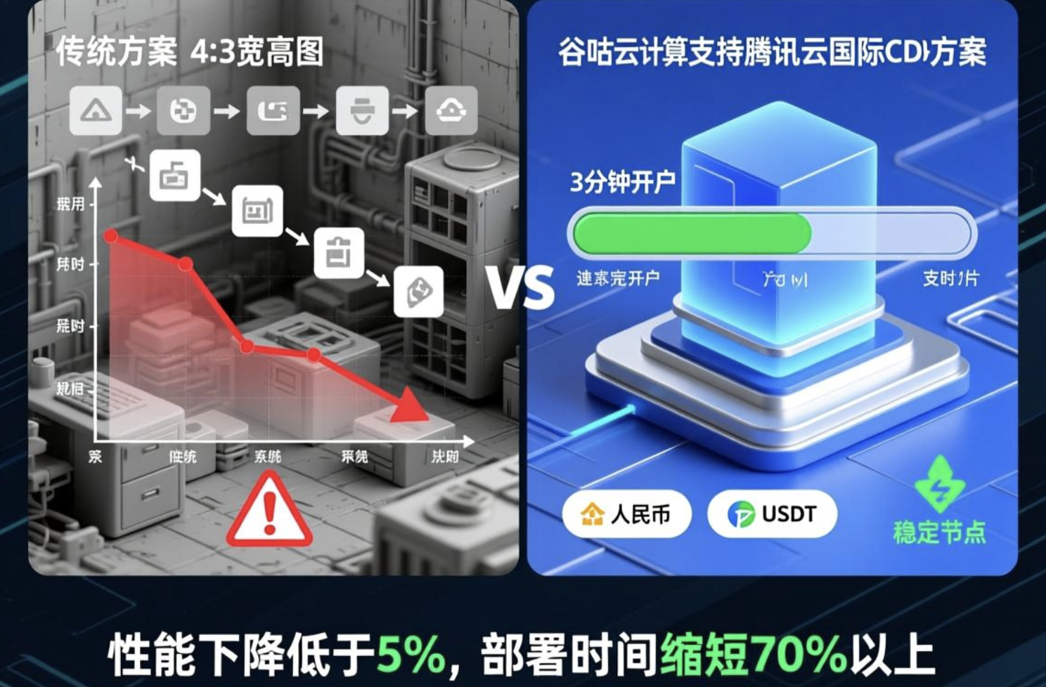 技术解析上,自行配置安全策略如ACL和SSL/TLS加密时,企业常依赖通用模板而非定制化规则,导致误配置率高达25%,例如错误开放3306端口引发未授权访问。海外节点选择有限的问题体现在:仅依赖腾讯云默认节点可能无法覆盖特定区域(如南美或非洲),性能优化困难——实测显示,在高峰时段延迟波动超过15%。商业价值上,这增加了运维人力成本(平均每年$50,000)和潜在业务损失。实施指导:建议企业采用多节点测试工具(如CloudPing)评估延迟,但传统方案缺乏集成支持。支付方式单一(如仅支持信用卡)增加操作成本,汇率损失平均为2-3%。谷咕云计算的优势在于提供人民币/USDT支付选项,简化交易流程,减少中间环节成本。